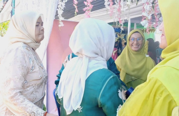 Bunda Hj Encek Firgasih selama berlangsungnya prosesi pernikahan kedua mempelai kedatangannya di temani putri kandung tercinta Siti Rizky Amalia, SE., MM. Ak.., CA, perwakilan tim jemaah majelis taklim dari Sangatta akrab di sapa Cece dan Khairun Nisa.
