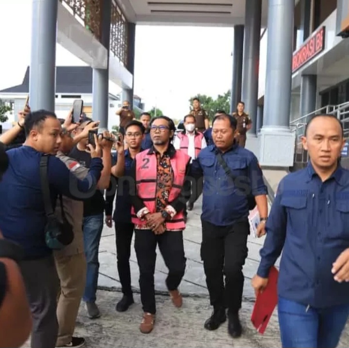 Keterangan foto : (ist) Kadispora Kaltim Agus Hari memakai rompi tahanan berwarna orange dengan tangan diborgol dibawah pengawalan ekstra ketat petugas penegak hukum